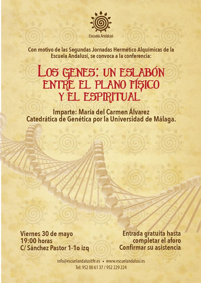 Este punto de partida de las Segundas Jornadas Hermético Alquímicas de la Escuela Andalusí se reforzará con la charla “Los Genes: Un eslabón entre el plano físico y el espiritual” en la Escuela Andalusí el próximo día 30 a las 19:00 horas y con la presentación oficial que tendrá lugar el 27 de junio en el ayuntamiento de Málaga.