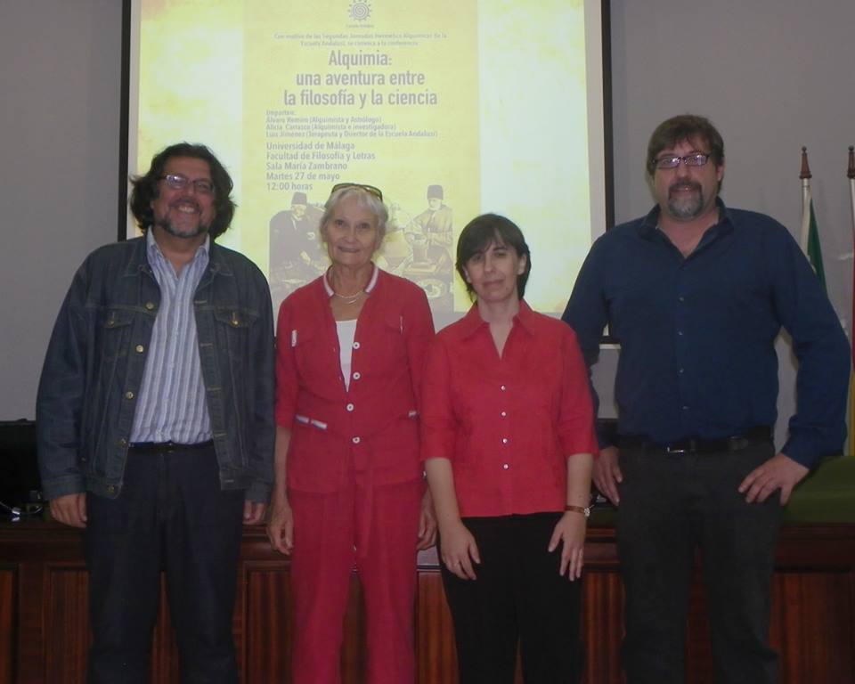 Alicia Carrasco, Álvaro Remiro y Luis Jiménez, presentador por la catedrática de genética Maria del Carmen Álvarez, compartieron con un nutrido grupo de estudiantes de la Universidad de Málaga y alumnos y ex alumnos de la Escuela Andalusí, dos horas y media en torno a la alquimia y su aplicación tanto terapéutica y espagírica como de desarrollo interior.